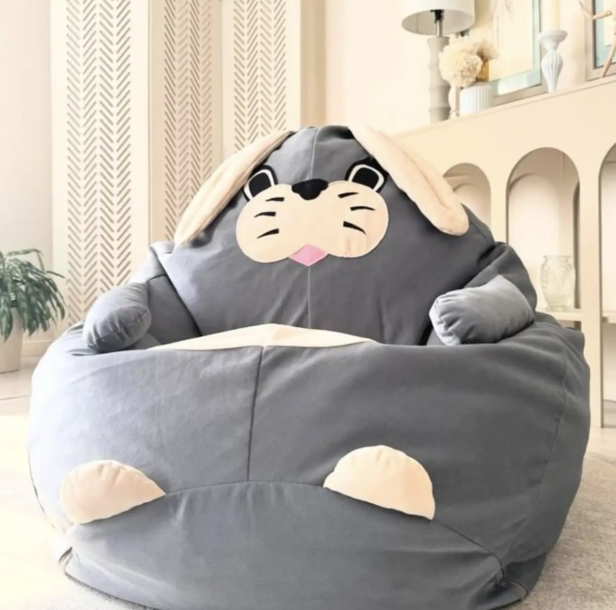 Крісло-мішок «Зайчик» м'який пуф у формі вушастого зайченяти з велюровим чохлом. Виглядає як іграшка, служить як повноцінне крісло. Велюр не линяє, не пилиться і приємний на дотик дитина із задоволенням торкається його щодня. Наповнювач із пінополістирольних кульок м'яко підлаштовується під форму тіла та повертає свою форму після кожного використання.